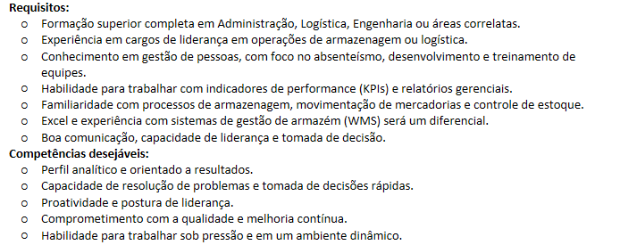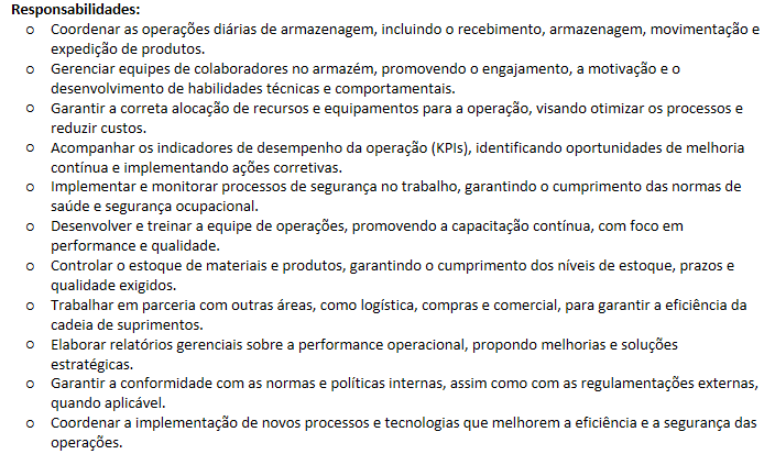 Você será responsável pelo gerenciamento completo das operações de armazém, garantindo a eficiência, a conformidade regulatória e a qualidade dos serviços prestados. Além disso, terá o papel de liderar, motivar e desenvolver as equipes sob sua supervisão, ajudando a elevar continuamente nossos padrões de desempenho.